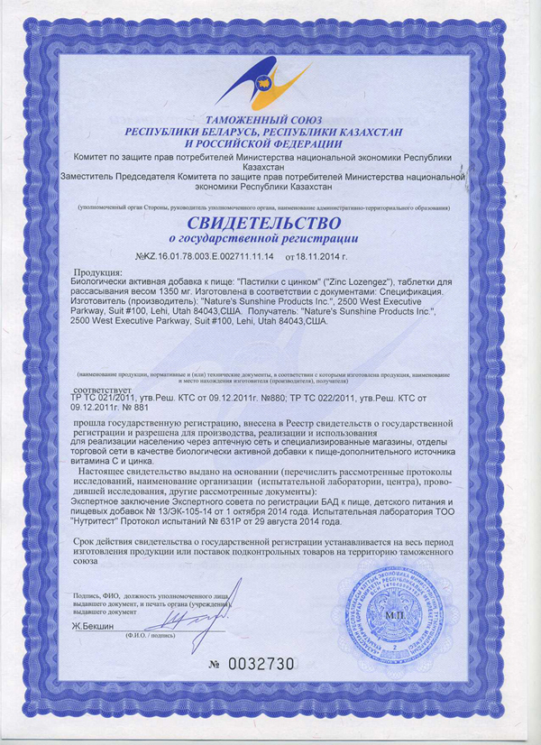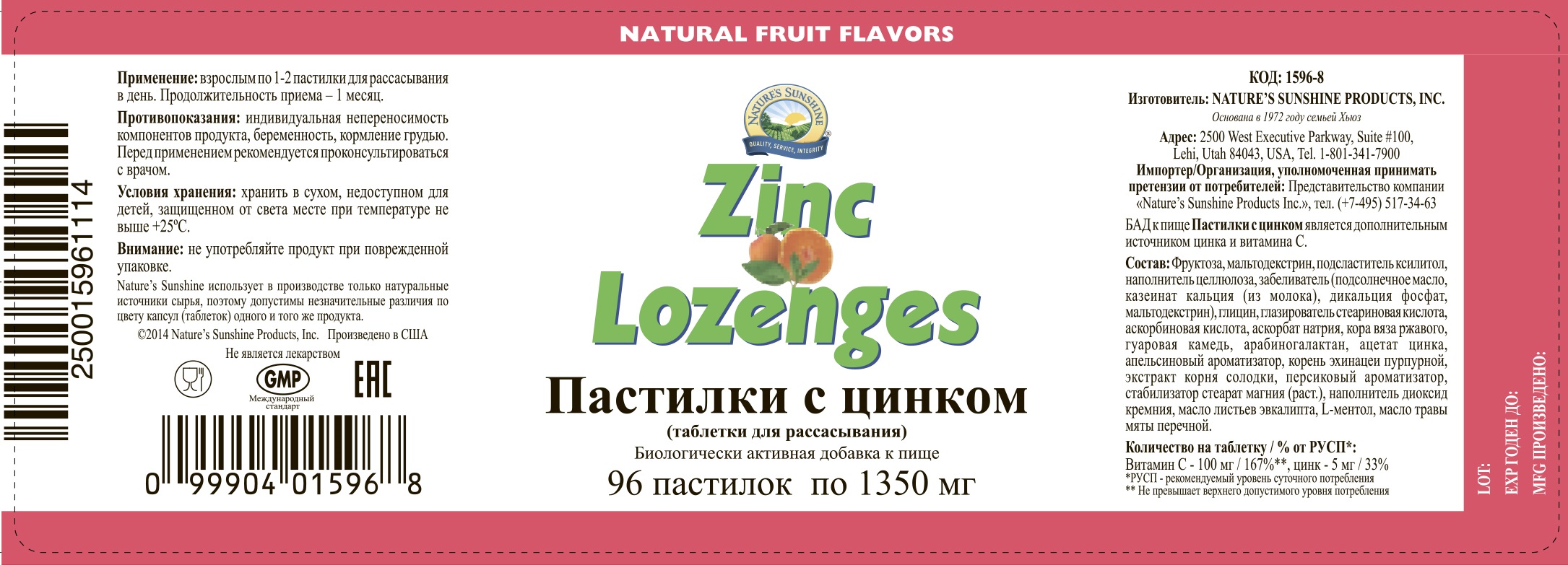 Цинк (в ацетате цинка) - 5 мг (41,7% от АСП); фруктоза – 410 мг (1,17% от АСП); ксилит - 150 мг (1% от АСП); мальтодекстрин - 242,4 мг; витамин С (аскорбиновая кислота, аскорбат натрия) - 100 мг (111% от АСП); глицин - 75 мг (3% от АСП); кора вяза ржавого (Ulmus rubra) - 25 мг; арабиногалактан (Cyamopsis tetragonolobа) - 15 мг; гуаровая камедь - 20 мг; корень эхинацеи пурпурной (Echinacea рurpurea) - 10 мг; экстракт корня солодки голой (Glycуrrhiza glabra) - 5 мг.